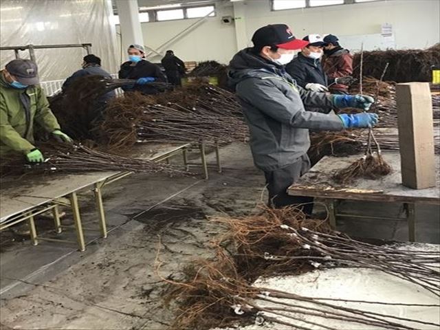 まず初めに、去年堀り上げしたりんごの台木の選別から始まります。
